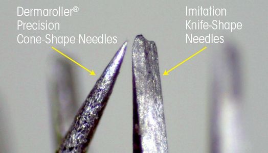 The medical-grade micro-needles of the eDermaStamp® are atraumatic (non-traumatic) cone-shaped needles that displace the skin during the puncture process, creating a micro-wound that seals within minutes of treatment. Poorer quality roller devices are made with knife-shaped needles that slice through tissue and risk causing traumatic skin, vessel and nerve damage. Poor quality needles also require increased pressure, making for a more painful treatment.